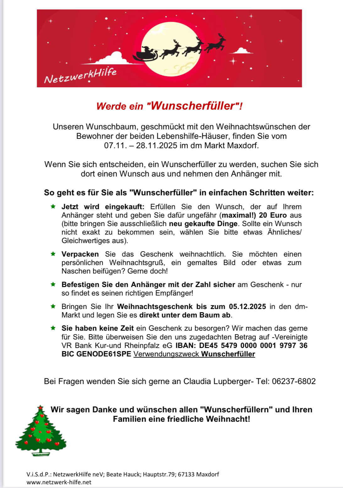 Auch dieses Jahr können Sie mit dem NetzwerkHilfe wieder zum "Wunscherfüller" werden und den Weihnachtswunsch eines Bewohners der beiden Lebenshilfe-Häuser in Maxdorf erfüllen. Die Aktion geht zugunsten der BewohnerInnen des Wilhelm-Hiemenz-Hauses sowie des Kurt-Hahn-Hauses. Beides sind Maxdorfer Wohnheime der Lebenshilfe Ludwigshafen, in denen Menschen mit Beeinträchtigungen leben.