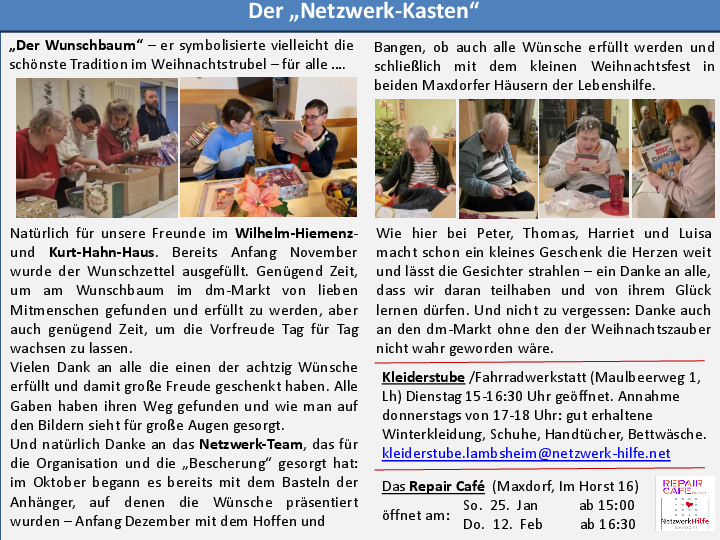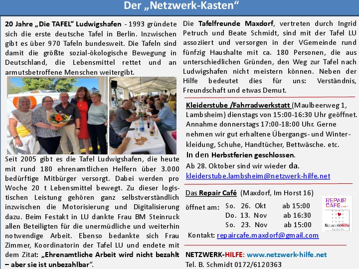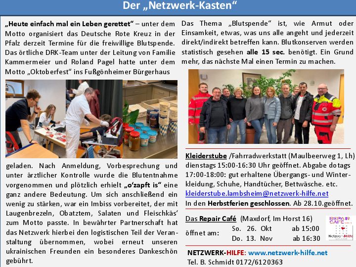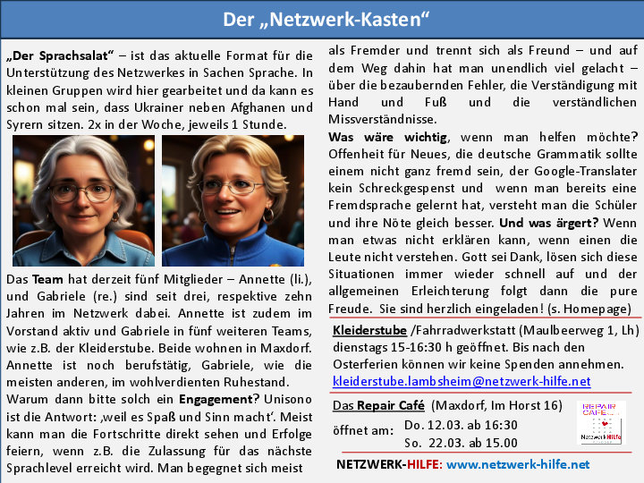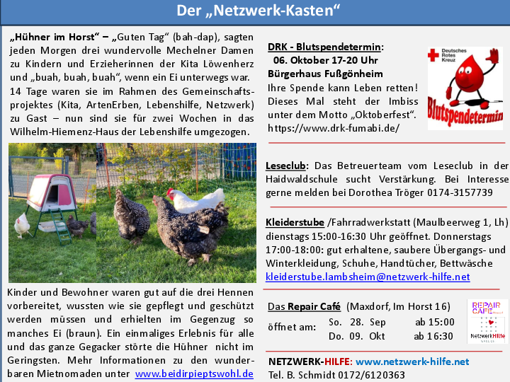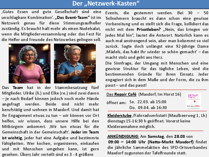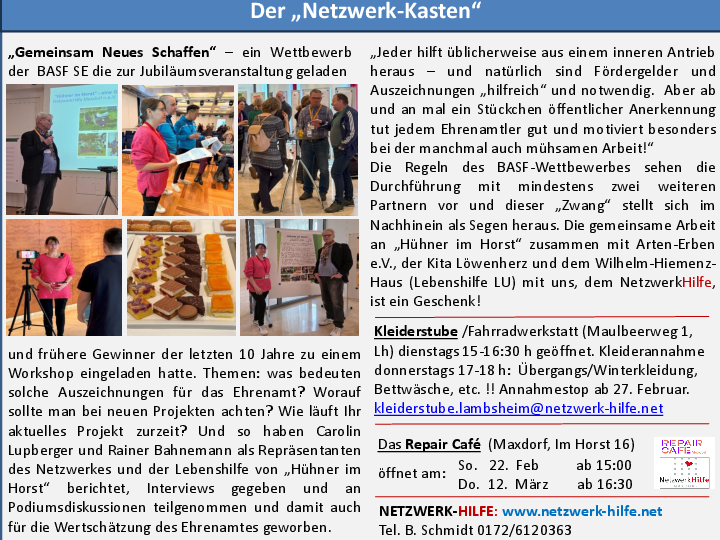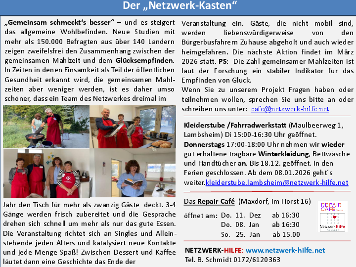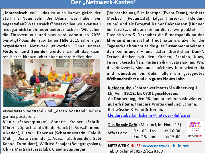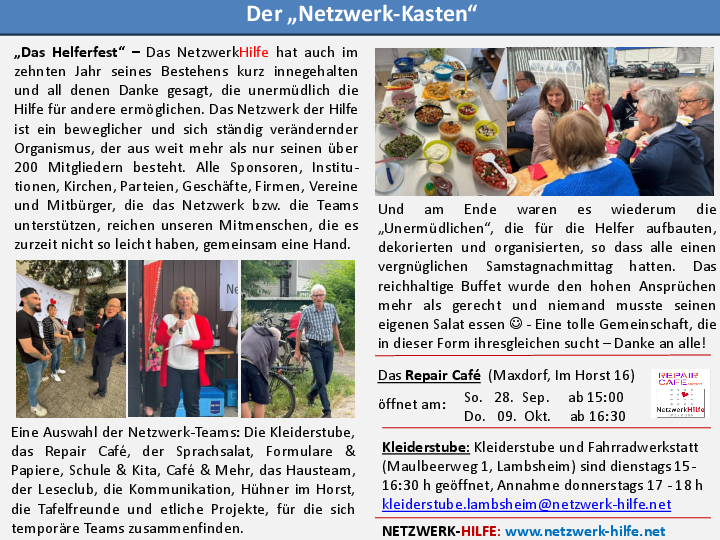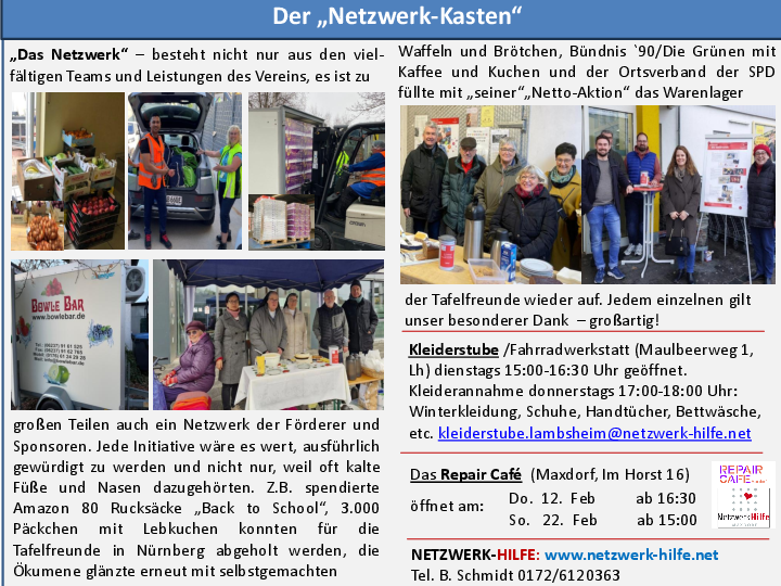 Spätestens jede zweite Woche wird dieser "Netzwerk-Kasten" mit neuen Informationen ergänzt und dazu hier veröffentlicht.
